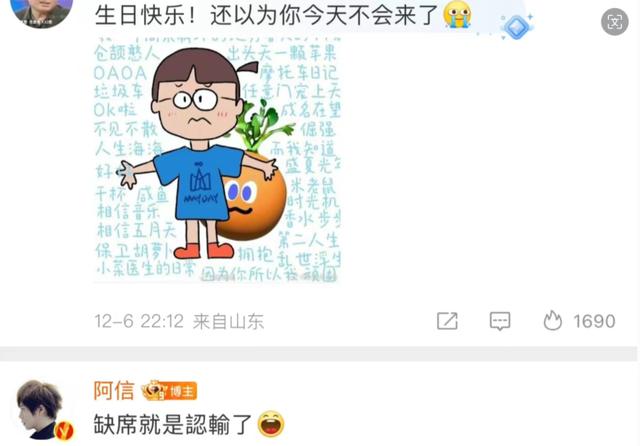 12月6日還是阿信48歲的生日,有粉絲留言說:“生日快樂!還以為你今天不會(huì)來了”。阿信顯得底氣十足的回應(yīng)說:“缺席就是認(rèn)輸了”。