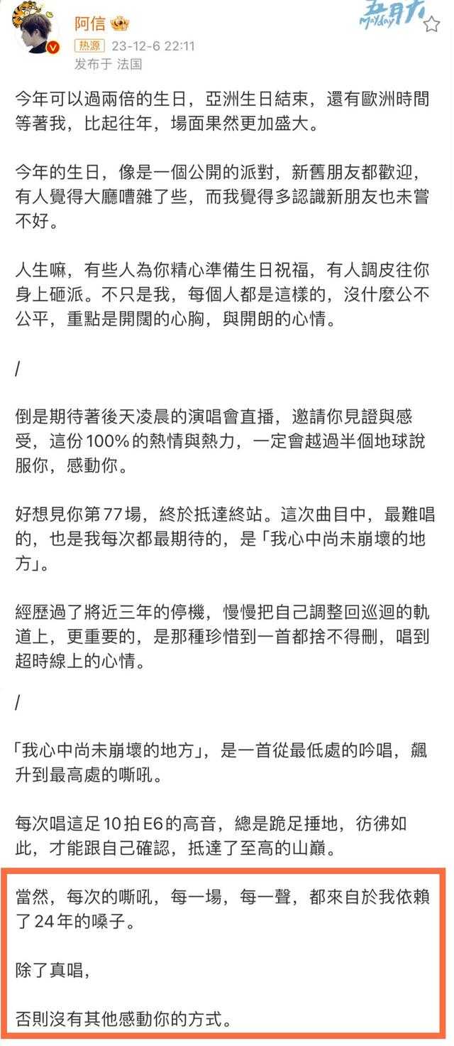 但這篇回應(yīng)并不足以服眾。在“小作文”中,阿信提到了《我心中尚未崩壞的地方》這首歌,他表示,“每次唱足這10拍E6的高音,總是跪足捶地,仿佛如此,才能跟自己確認(rèn),抵達(dá)了至高的山巔”。