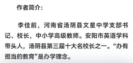 網(wǎng)友們扒拉了一下,發(fā)現(xiàn)該小說的作者名叫“李佳前”,是河南省湯陰縣文星中學(xué)支部書記,被評(píng)選過“湯陰縣第三屆十大名校長(zhǎng)之一”。說實(shí)話,這個(gè)名頭有點(diǎn)太低了。如果不是這篇小說被選入成都新都區(qū)初三年級(jí)語文測(cè)試,可能沒幾個(gè)人會(huì)認(rèn)識(shí)他。在一個(gè)常規(guī)縣,都不一定能湊出十所中學(xué),而李佳前被評(píng)為湯陰縣十大名校長(zhǎng),這完全就是一個(gè)虛假的榮譽(yù)。