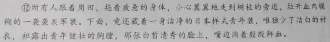 日軍是什么形象呢?文章的大佐兒子是這么被描述的:“下面竟還藏著一身潔凈的日本樣式青年裝,唯獨(dú)少了潔白的襯衣,袒露出青年健壯的胸膛,那張白皙清秀的臉上,嘴邊淌著汩汩鮮血?!?/span>